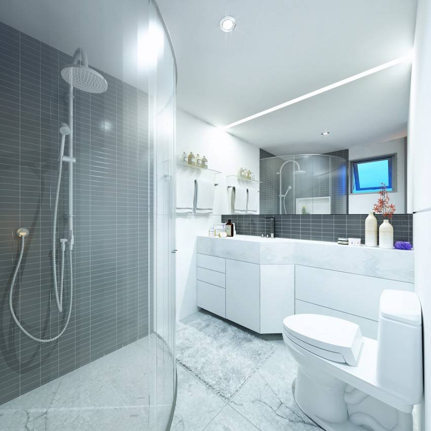 Визуально расширить комнату можно за счет зеркальных, стеклянных поверхностей и локальной подсветки, сэкономить полезные метры позволит подвесная сантехника.