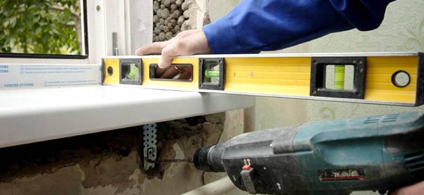 Величину уклона замеряют строительным уровнем. Правильность установки проверяют в средней и крайних частях панели. При обнаружении отклонений под доску подкладывают щепки. После установки в нужное положение края подоконника фиксируют.