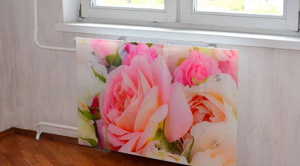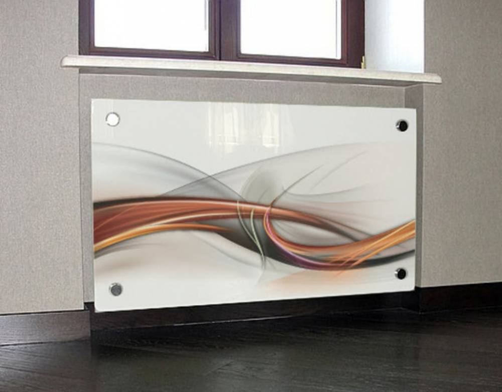 Очень интересный способ декора, относящийся к стилю ар-нуво. Стеклянная панель на батарею выглядит стильно, дорого, необычно. Цветной экран готовят из закаленного стекла для витражей, края его шлифуют. Стекло может быть цветным или выступать фоном для нанесения рисунков, фотопечати, аэрографии.