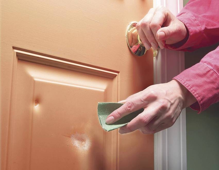 Если на самом дверном полотне есть дефекты (трещины или щели), то их нужно будет устранить до нанесения нового покрытия. Заделать дефекты на полотне своими руками не слишком сложно: