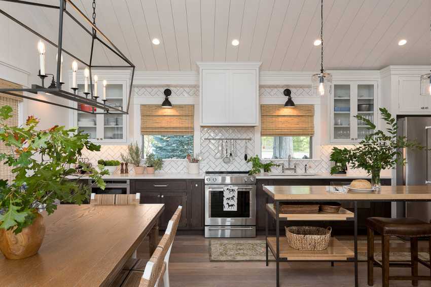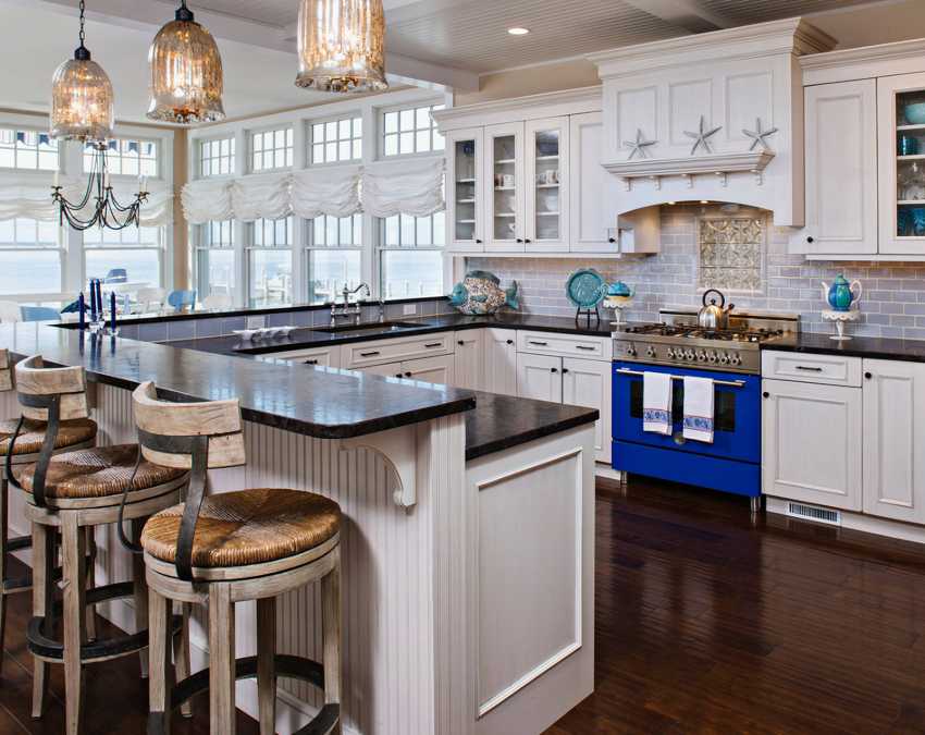 - Скандинавский или морской стиль тяготеет к использованию в интерьере кухни синих и белых цветов.