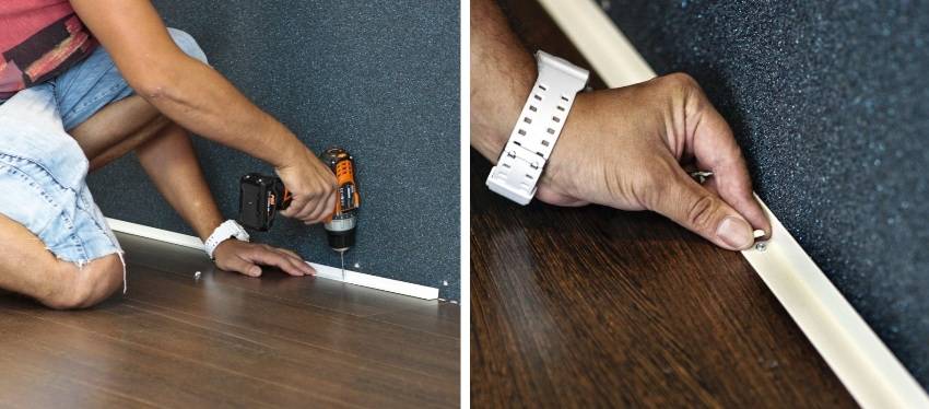 В этом случае, нужно плинтус прикрутить не к напольному покрытию, а к стене. Это связано с тем, что многие материалы, используемые для покрытия пола, во время эксплуатации могут расширяться и сужаться, поэтому если к ним прикрепить плинтус, то он будет деформироваться.