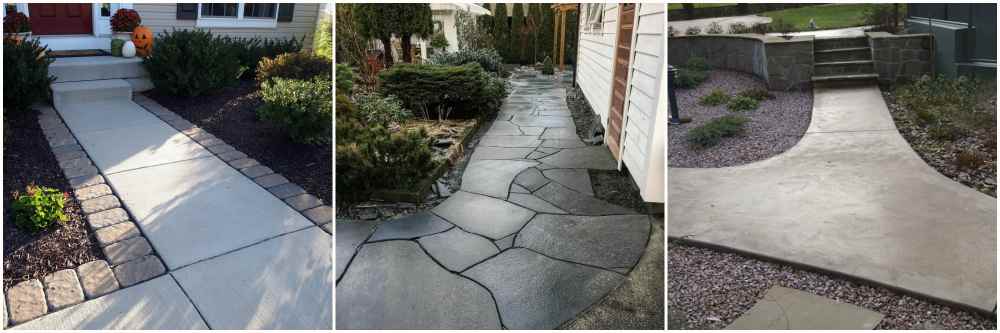 - Бетон – материал №1. Отличается широким спектром возможностей. В строительном магазине можно выбрать плиты для садовых дорожек разных форм. Или залить обычное наливное полотно. Кроме того, бетон – это основа для нанесения декора.