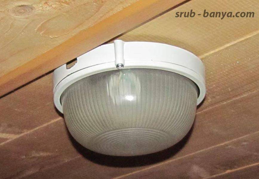 Светильник в парилке. 7. Светильники, применяемые в бане должны быть герметичными, надёжно защищёнными от влаги и высокой температуры. Класс защиты не ниже IP-44. Корпус — металлический, плафон — стеклянный. Плафон, желательно, должен быть защищён сеткой (для предотвращения разлёта осколков). Светильник в парилке должен размещаться так, чтобы предотвратить возможность соприкосновения с веником парильщика, который находится к светильнику ближе всех. |