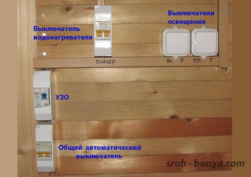 Электрические приборы во входном тамбуре. 2. Схема электрооборудования достаточно проста. Кабель, который подводит электричество в баню, подключается к общему автоматическому выключателю, который срабатывает на короткое замыкание и имеет номинал 16А или 25А. Далее подключается устройство защитного отключения — УЗО.