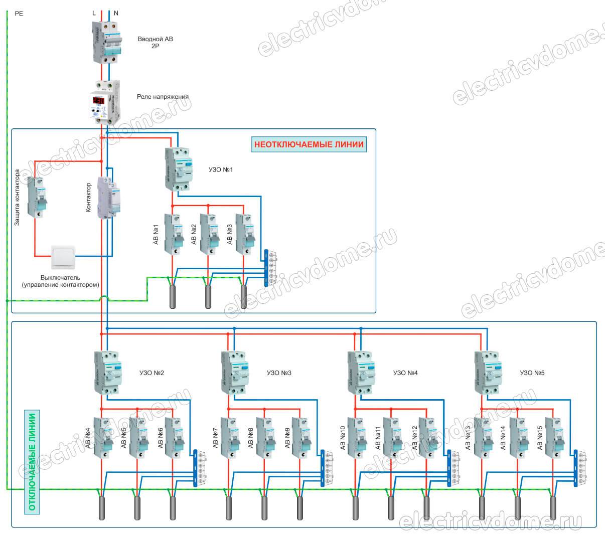Для трехфазного напряжения сети больших различий в схеме нет. Применяется другой принцип распределения потребителей: отдельные группы подключаются к отдельным фазам