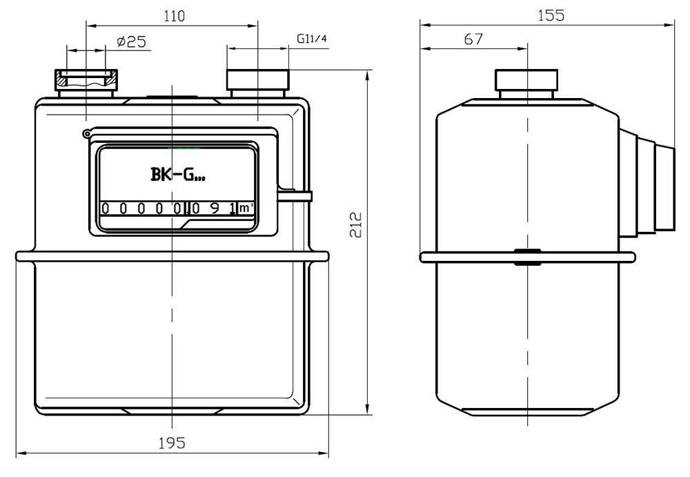 - G2,5 – Минимальный расход газа – 0,025 м3/ч. Номинальный – 2,5 м3/ч. Максимальный – 4,0 м3/ч.