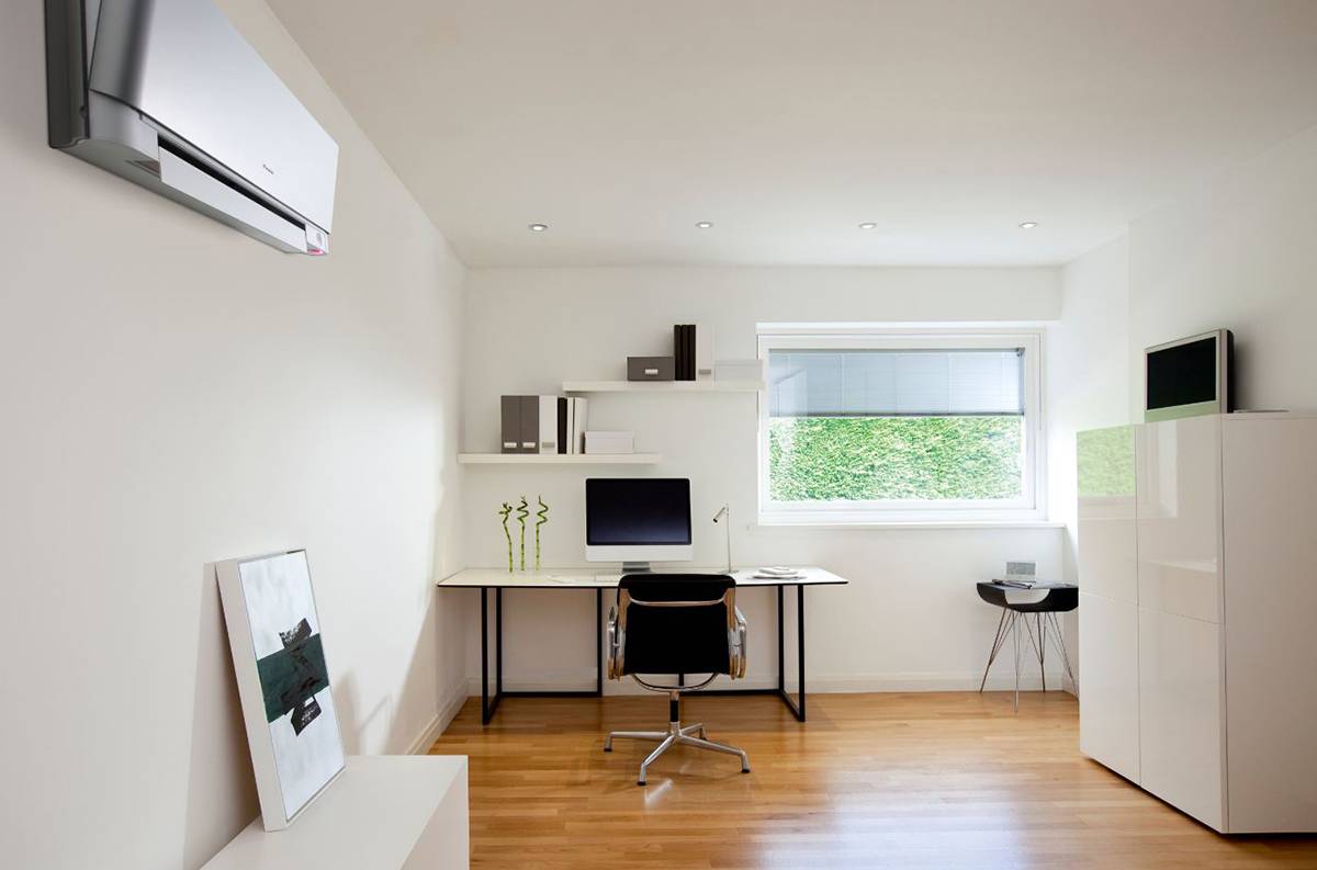 Настенные варианты внешне выглядят как обычный бытовой кондиционер. Монтируются на стену, установка проста, недорогая по стоимости. Лучше всего подходят для помещений с низкими потолками, невозможностью сконструировать подвесной потолок. Наиболее оптимальный вариант для небольших офисных помещений.