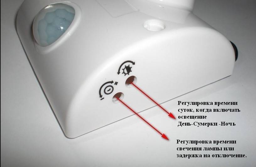Регулировочные рычажки находятся на лицевой или тыльной стороне корпуса. Они подписаны – SEN (чувствительность), Time (время задержки), LUX (уровень освещенности).