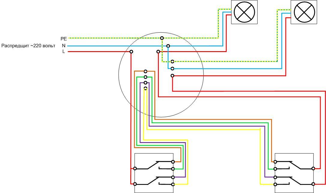 Общий вид схемы подключения проходного выключателя с 2х мест