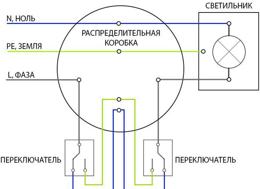 Принципиальная схема подключения проходного выключателя с 2-х мест