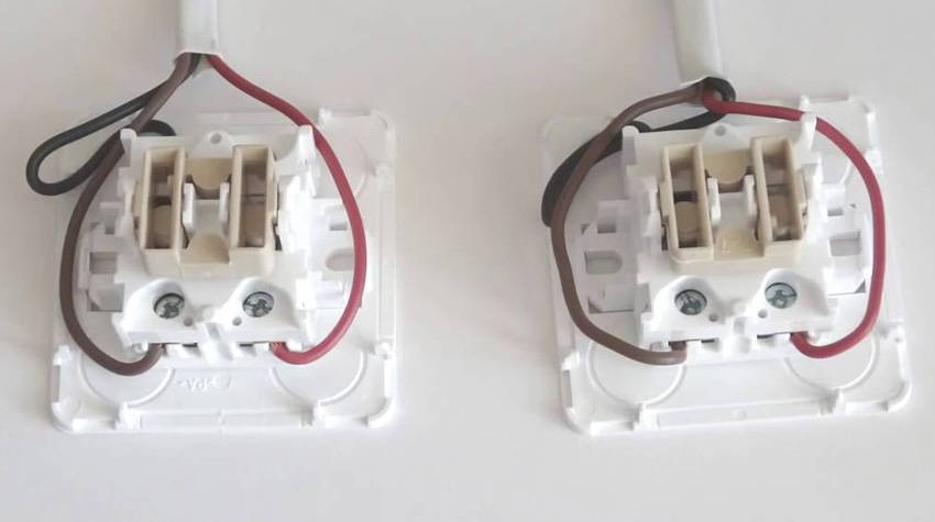 Из схемы понятно, что у каждого из выключателей должно быть три клеммы – одна для фазы, которая идет от источника питания и две на «управляющие» провода. Когда у любого из двух переключателей меняется положение, то цепь либо замыкается, либо размыкается – в зависимости от того, в каком состоянии она находилась до этого.