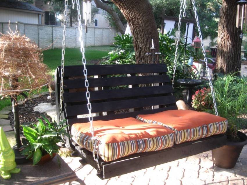 Для мебели на дачном участке поддоны в цельном виде либо разобранные на доски — идеальный материал. Ведь здесь главную роль играет не дизайн, а практичность.