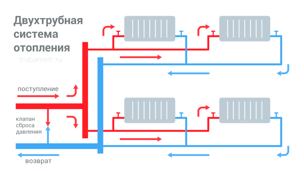 2-х трубная система использует попутную или тупиковую схему движения теплоносителя. В первом случае разрешено устанавливать батареи с одинаковой теплоотдачей или радиаторы с разной мощностью, но с термостатическими клапанами.