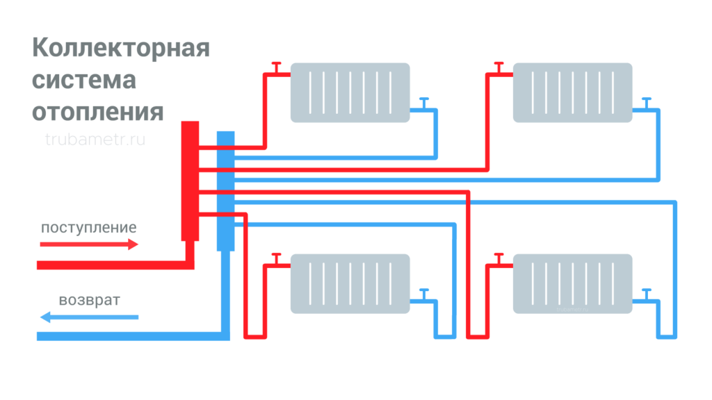 В такой системе используется гребенка. Она является коллектором и устанавливается на подаче и возврате. Это двухтрубный тепловой контур. Монтируется отдельная труба, как для подачи теплоносителя к каждому радиатору, так и для возвращения остывшей воды.