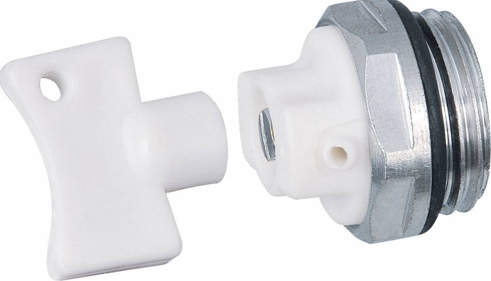 Монтаж крана в батарею. Пластиковый кран разбирается. Затем штуцер вкручивается в посадочное гнездо и фиксируется накидной гайкой, после чего гайка плотно затягивается. Пластиковый корпус крана одевается поверх штуцера.