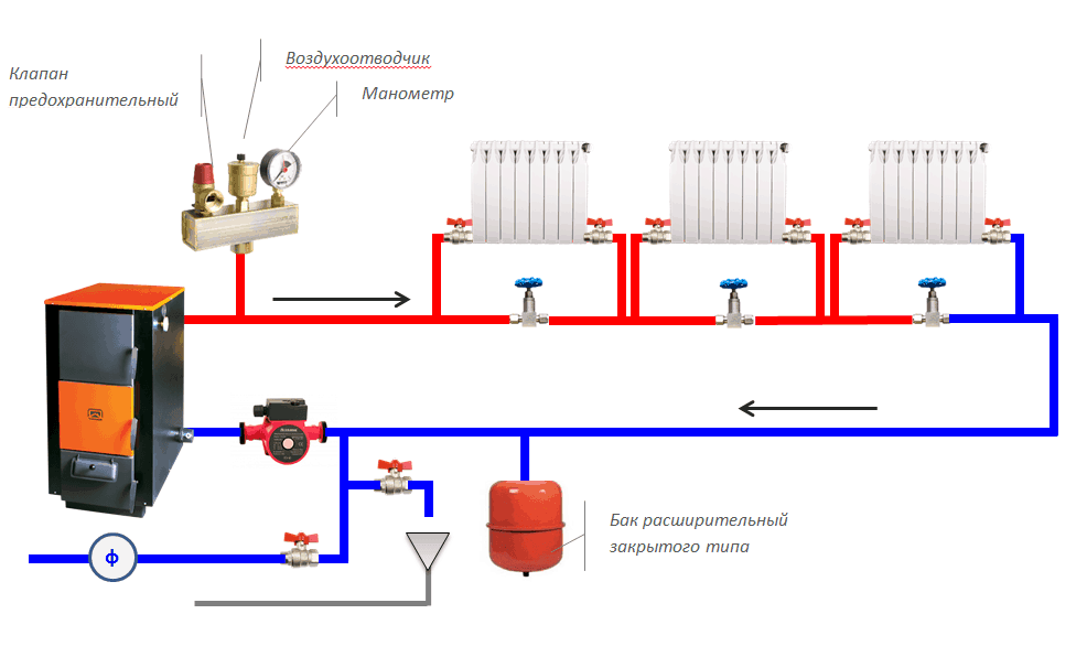 Данная схема предполагает установку мембранного расширительного бачка, который создает в конструкции избыточное давление в пределах 1,5 атмосфер. Система закрытого типа нуждается в монтаже дополнительного оборудования, такого как манометр, воздухоотводчик и предохранительный клапан.