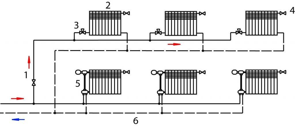 2-х трубная система использует попутную или тупиковую схему движения теплоносителя. В первом случае разрешено устанавливать батареи с одинаковой теплоотдачей или радиаторы с разной мощностью, но с термостатическими клапанами.