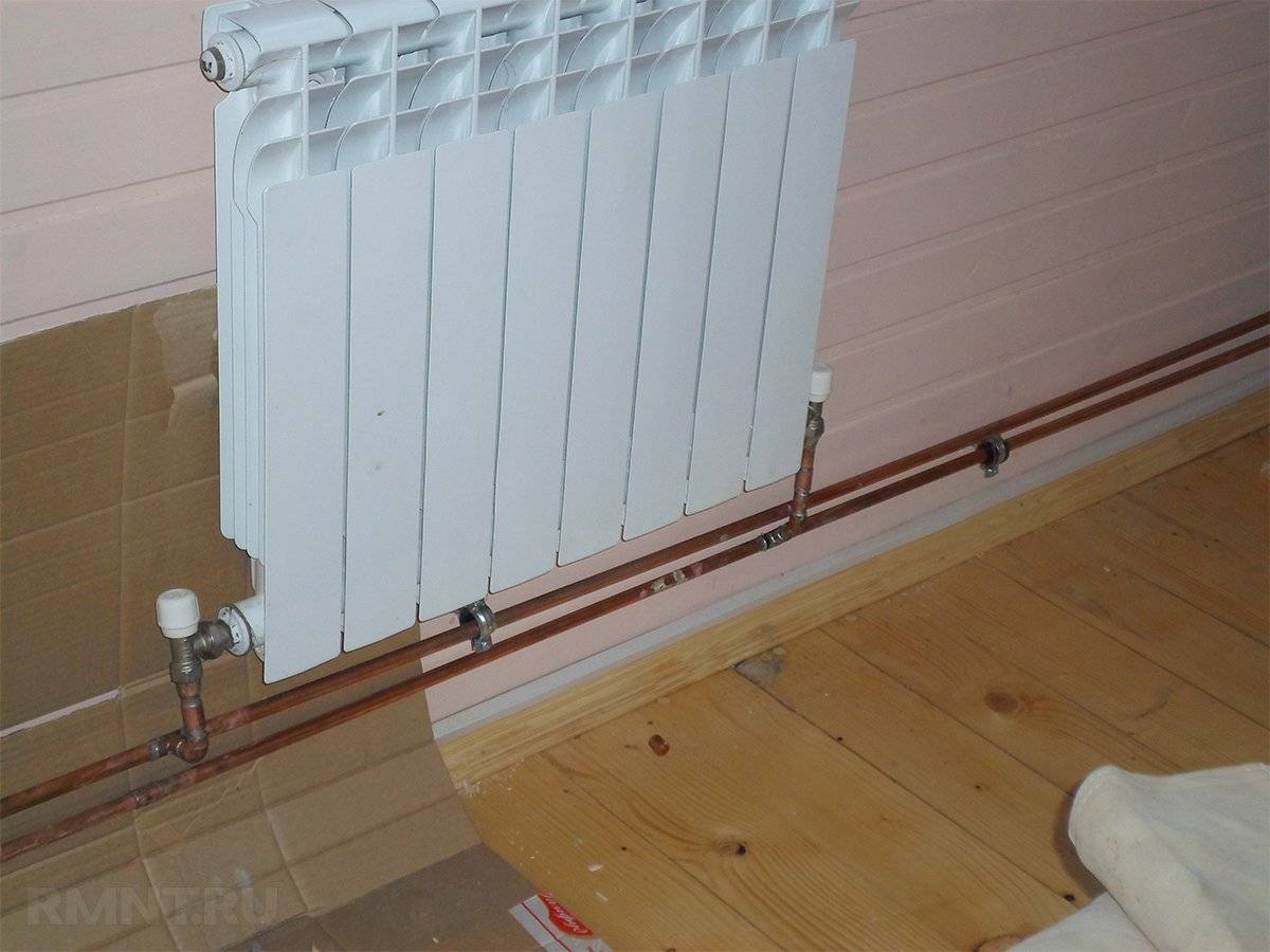 - Радиаторы ставят биметаллические или стальные с нижней системой подключения. У таких батарей выше гидравлическое сопротивление, что балансирует систему. Мощность радиаторов должна быть одинакова по всей площади дома.