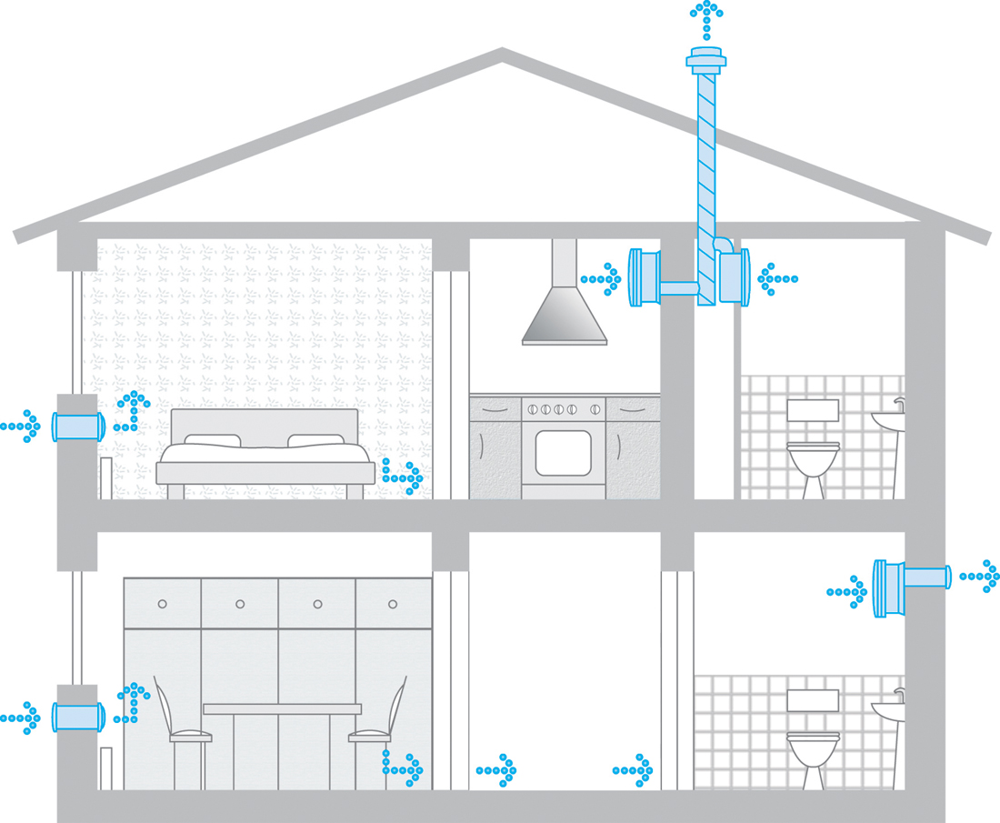 Свежий воздух поступает в жилые комнаты через открытые окна или форточки, а в холодное время года через каналы приточной вентиляции в наружных стенах и оконных рамах. Каналы оснащаются приточными клапанами, рекуператорами или бризерами. Поступающий с улицы воздух вытесняется в коридор через дверной проем. Дверь должна пропускать воздух даже в закрытом положении. Обычно для этого достаточно щели между дверным полотном и полом шириной около 1 см.