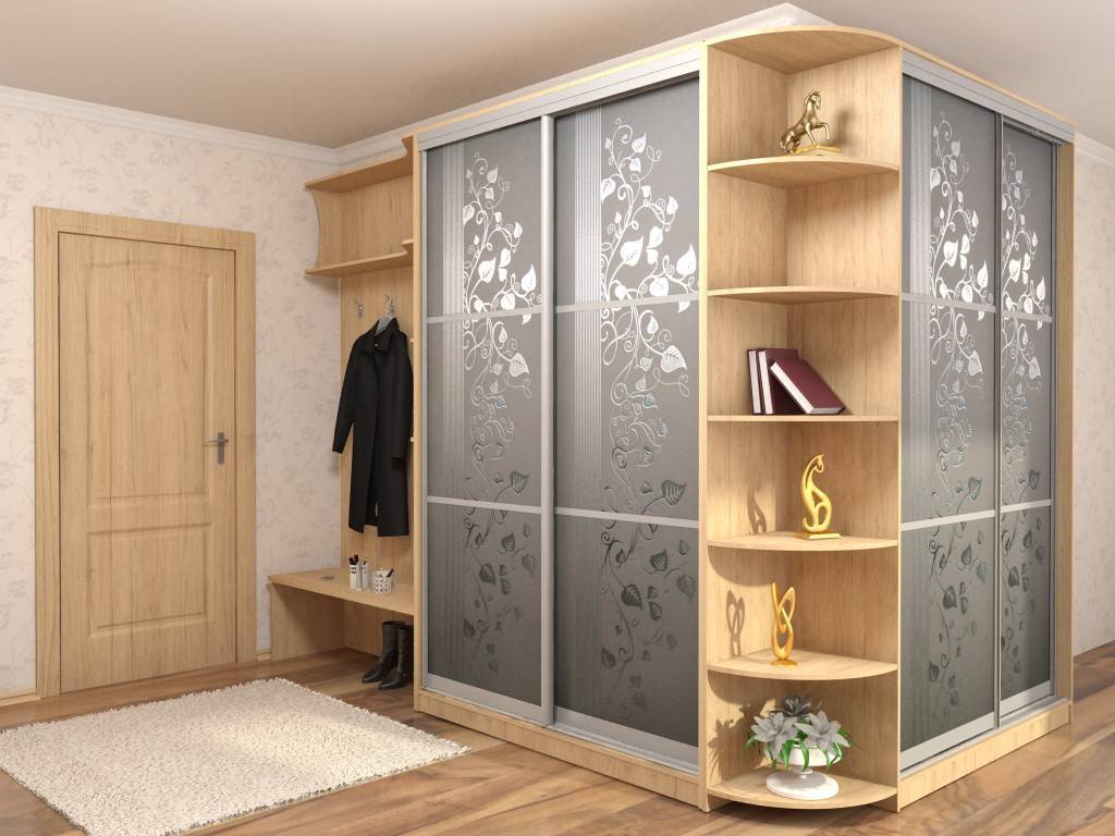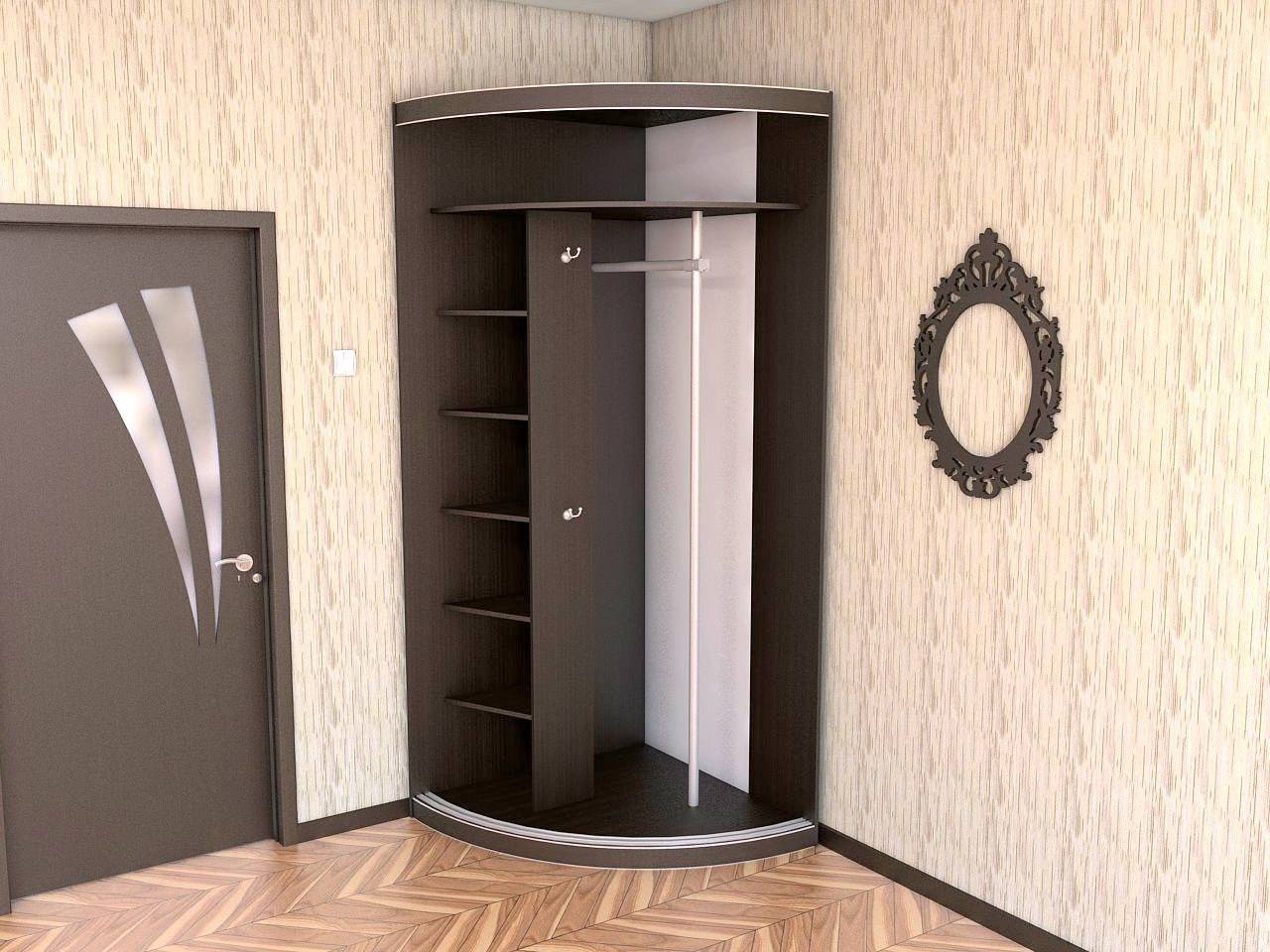 Довольно оригинальный визуально вариант с нестандартной формой, представляющий собой этакую миниатюрную гардеробную. Используется в основном в небольших помещениях, но это вовсе не значит, что такое решение не подойдет для просторной прихожей. Угловую часть с обеих сторон дополняют боковые элементы. Ширина и глубина секций может быть различной, в соответствии с площадью прихожей. Средняя высота шкафа – 2 метра.