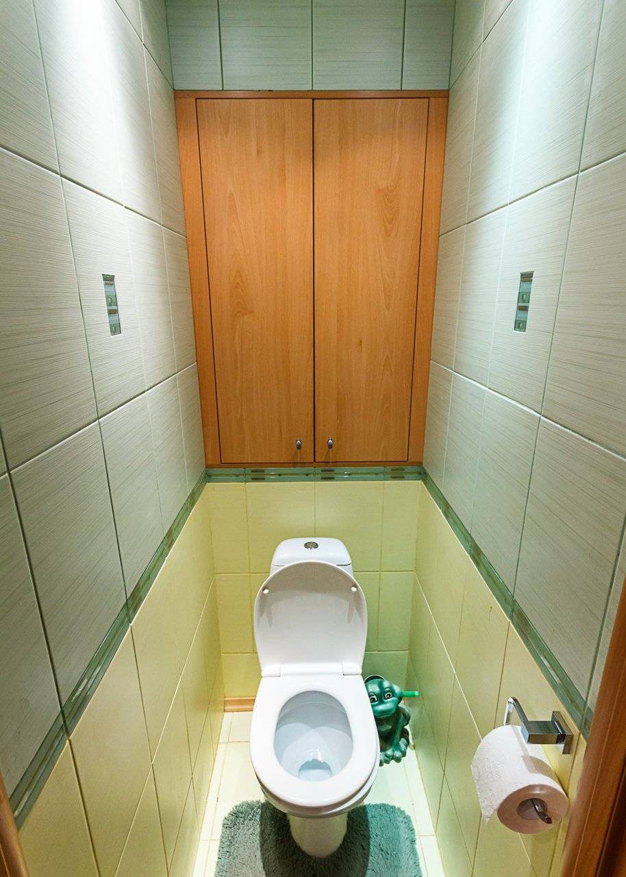 В большинстве квартир туалет — узкое и длинное помещение. Ширина его около метра, длина — метра два или больше. Такое длинное помещение неудобно в использовании — площадь до двери все равно никак не используется. Улучшить ситуацию можно установив фальшстену. При этом унитаз можно подвинуть вперед, а перегородкой отгородить 50-60 см. Оставшегося пространства более чем достаточно для комфорта, а то, которое окажется «за стеной», вполне можно использовать как шкаф.