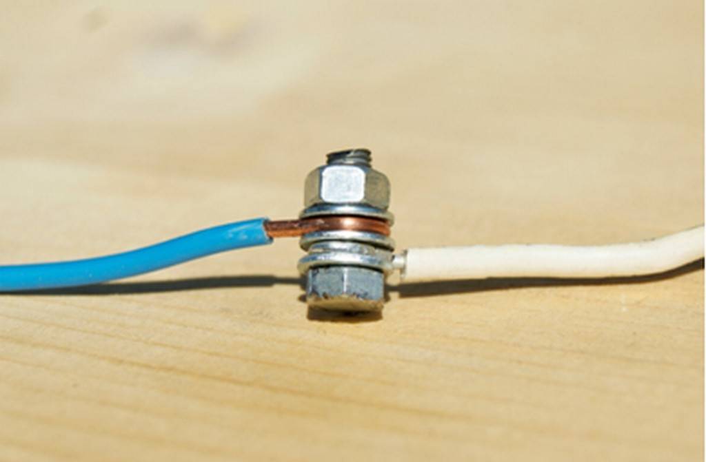 При соединении проводов, сделанных из одного металла, или залуженного медного проводника с алюминиевым проводом между кольцами проводников укладывать шайбу не нужно. Многожильный медный проводник следует обработать припоем.