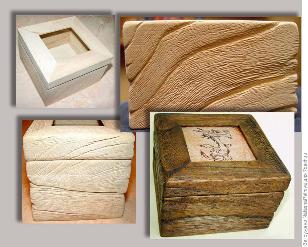 С помощью различных щёток можно имитировать не только атмосферное старение (воздействие ветра, солнца), но и эффект обкатанной водой деревяшки – такие можно найти на берегу реки или моря. В этом случае древесина обрабатывается более глубоко, и «следы времени» могут быть не только вдоль волокон. Пример такого состаривания – шкатулка на фото ниже.