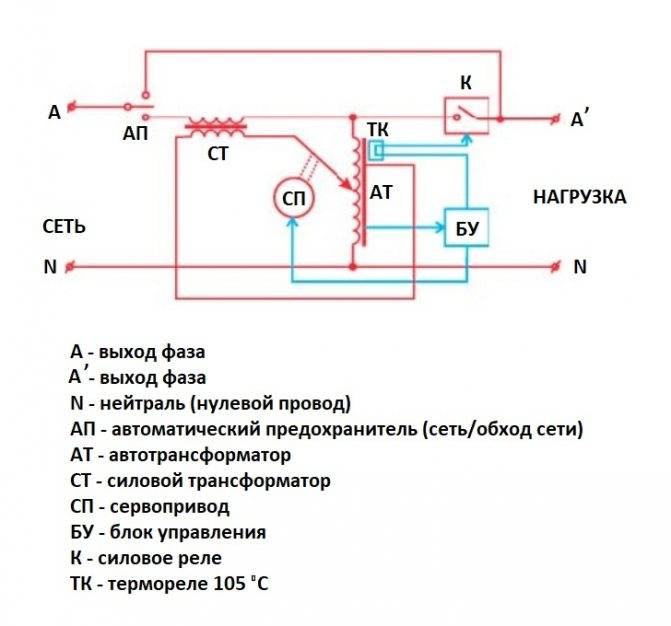 Фактически речь идет о схеме, где используется принцип автотрансформатора. Трансформация напряжения автоматически осуществляется за счет управления реостатом, ползунок которого перемещает сервопривод.