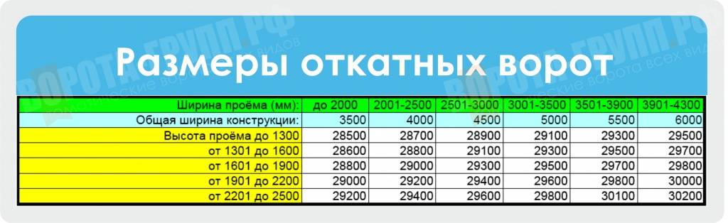 Ширину откатных ворот рекомендуется делать такой, чтобы при въезде автомобиля в ворота между зеркалами заднего вида и опорными трубами ворот было расстояние не меньше 45 см. Чаще всего встречаются ворота с максимальной шириной равной 4 метра. При этом ширину створки ворот делают на 40-45 см больше проёма, чтобы избежать щели, просвечивающей дачный участок.