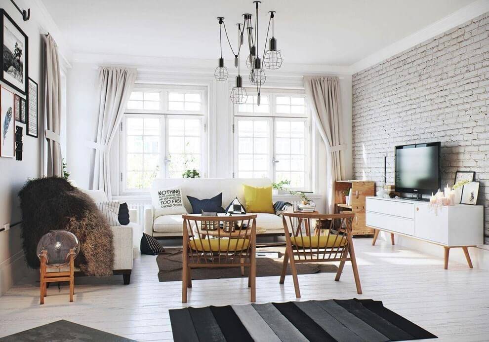 Скандинавский стиль включает в себя также применение камня или кирпича. Для создания скандинавского минимализма в современном стиле часто используются детали кирпичной кладки, кованые декорации, плетеная мебель. Крашенная в светлые оттенки или под натуральный цвет кирпичная кладка прекрасно подчеркивает заданный стиль и совершенство вкуса владельцев. А камин с настоящим огнем придает интерьеру уют, тепло и очарование.