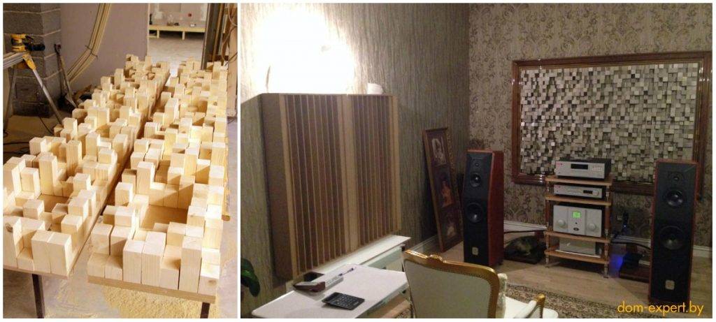 Помимо эстетической функции, слегка изменив длину обрезков, примененных в этом панно, можно создать не менее красивые акустические диффузоры. Такие панели рассеивают падающий на них звук, избавляя комнату от эха. Диффузоры обычно ставят в музыкальных студиях, комнатах для прослушивания музыки, домашних кинотеатрах.