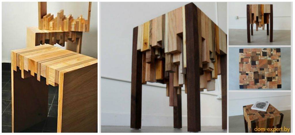 Если лень обрезать доски/брусья до одинаковых размеров — можно призвать на помощь смекалку и сделать вот такой вот дизайнерский табурет. И даже не один.