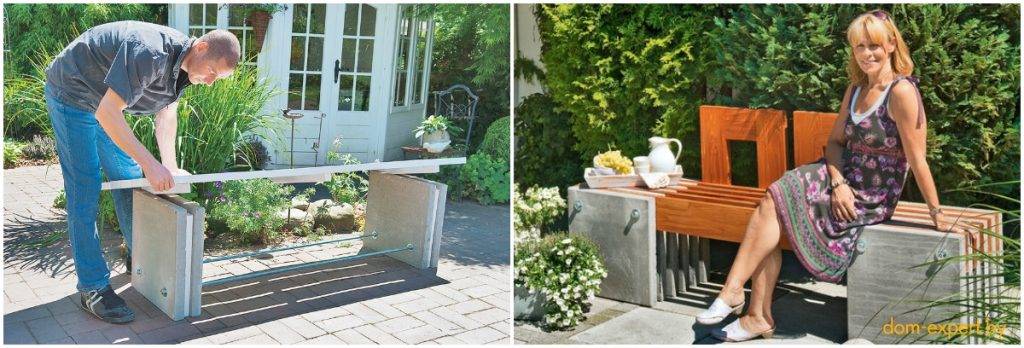 А если досок осталось совсем немного, зато есть пара лишних плиток — вполне можно совместить одно с другим, получив «на выходе» вот такую стильную скамейку.