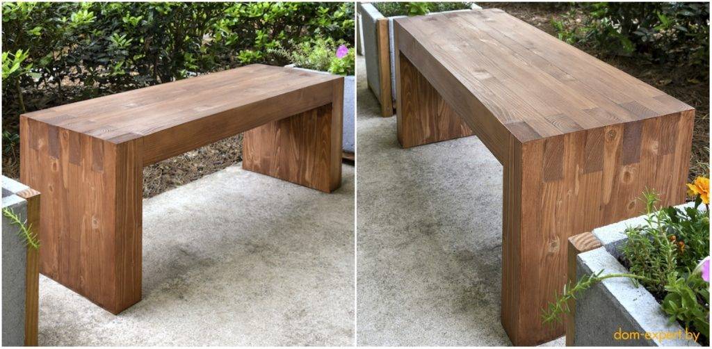 Для столешницы подбирают доску около 4-5 см шириной. Чтобы она была устойчивой, можно использовать каркас. Ножки можно делать крестообразными или просто прямыми, здесь годится любой вариант. Если готовое изделие пропитать лаком или покрыть краской, оно будет служить дольше. Лаком рекомендуется покрывать в несколько слоёв.