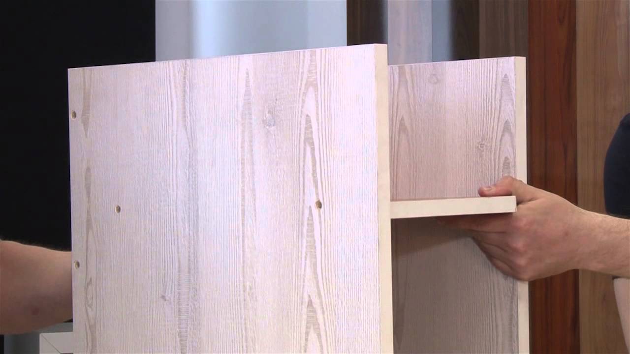 - Соединить полку с боковой стенкой и центровой ножкой.