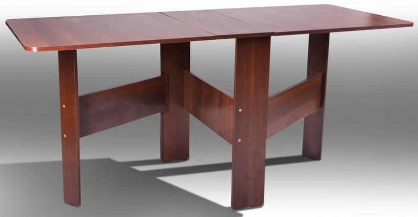 Один из хорошо знакомых вариантов — раскладной стол-книжка (один из вариантов на фото выше). Это когда центральная часть стола фиксированная, а боковые прикреплены к ней при помощи петель. При необходимости одна из подвижных ножек выдвигается, поднимая закрепленную столешницу.
