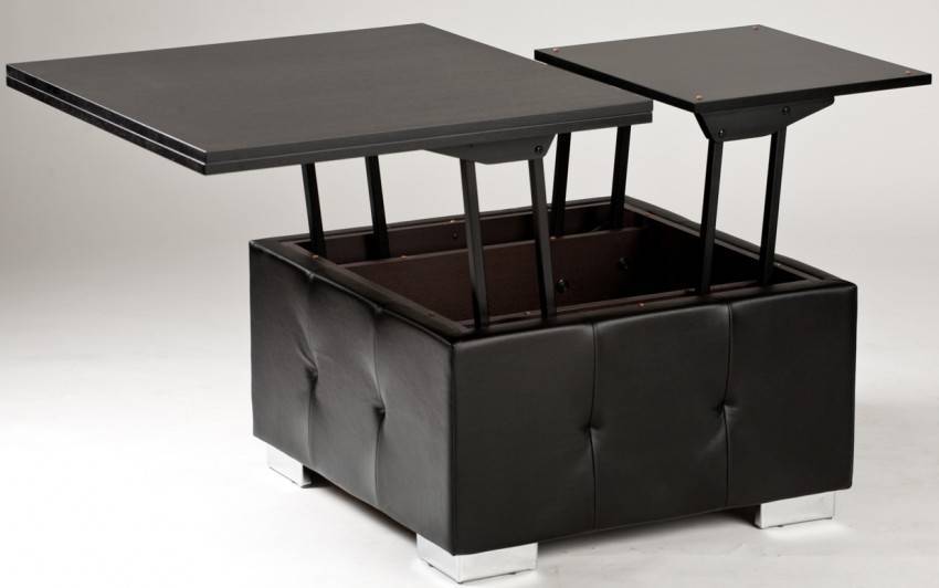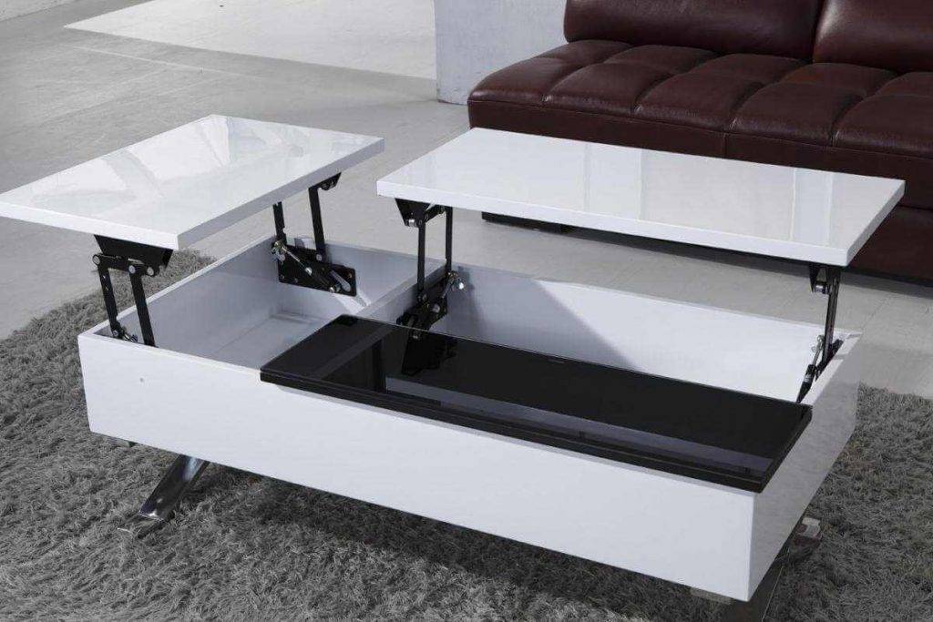 Подъемная столешница разделена на несколько частей (2 или 3). Каждая из них способна изменять высоту по отдельности. Это позволяет использовать ее одновременно для различных целей: работать с ноутбуком, пить чай или кофе. Объем, который срыт под поверхностью служит местом хранения. Трансформация происходит благодаря газлифту или пружинному устройству.