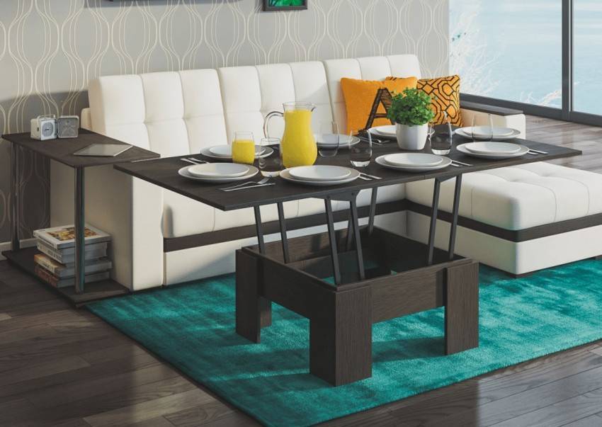 Они прекрасно сочетаются и с классическим интерьером, и с современными стилями, и с этникой. Акцент на обеденной зоне поставит журнально-обеденный стол. Компактный в сложенном виде, он становится полноценным местом для приема пищи всего за несколько секунд, а также заменяет рабочий стол.