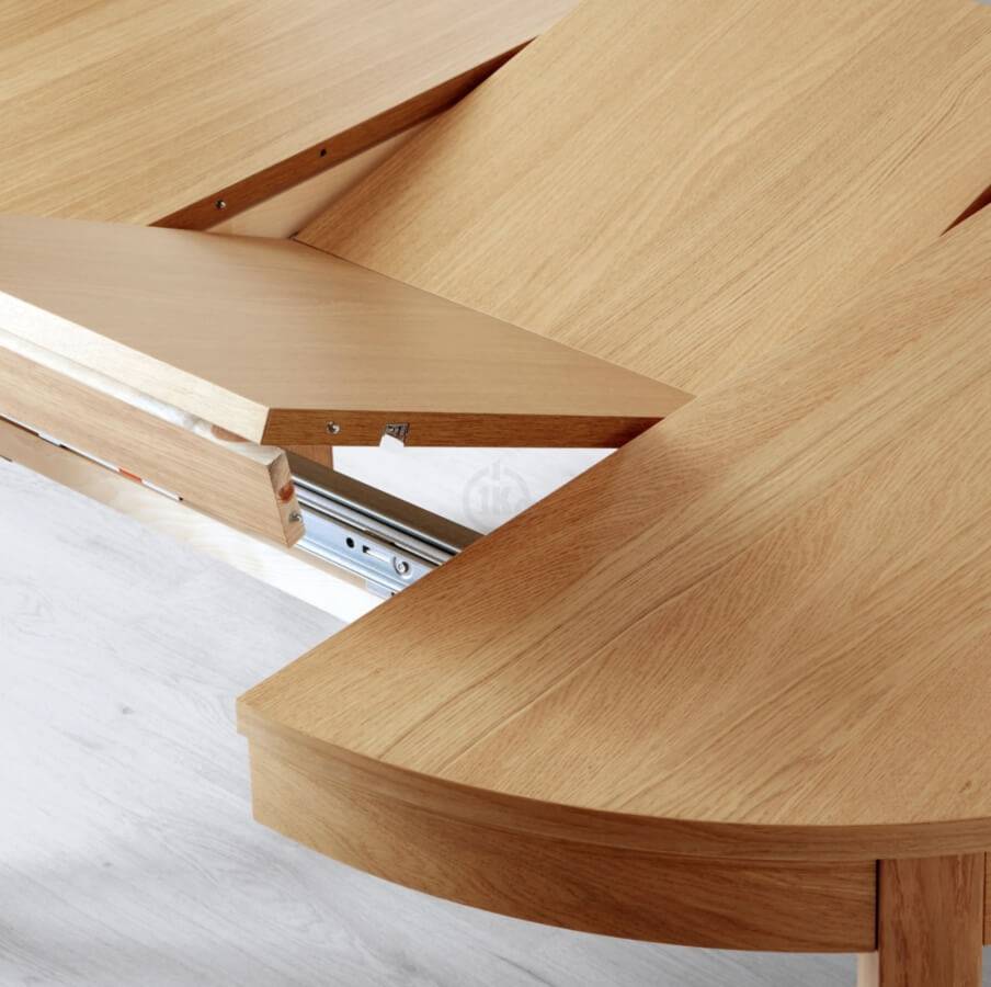 Раздвижной стол увеличивает размер столешницы в длину или ширину за счет специальных вставок, которые до поры прячутся в подстолье. Они устанавливаются по центру или боковым краям. В конструкции присутствует система направляющих, которая обеспечивает движение отдельных элементов и служит опорой для вставной детали.