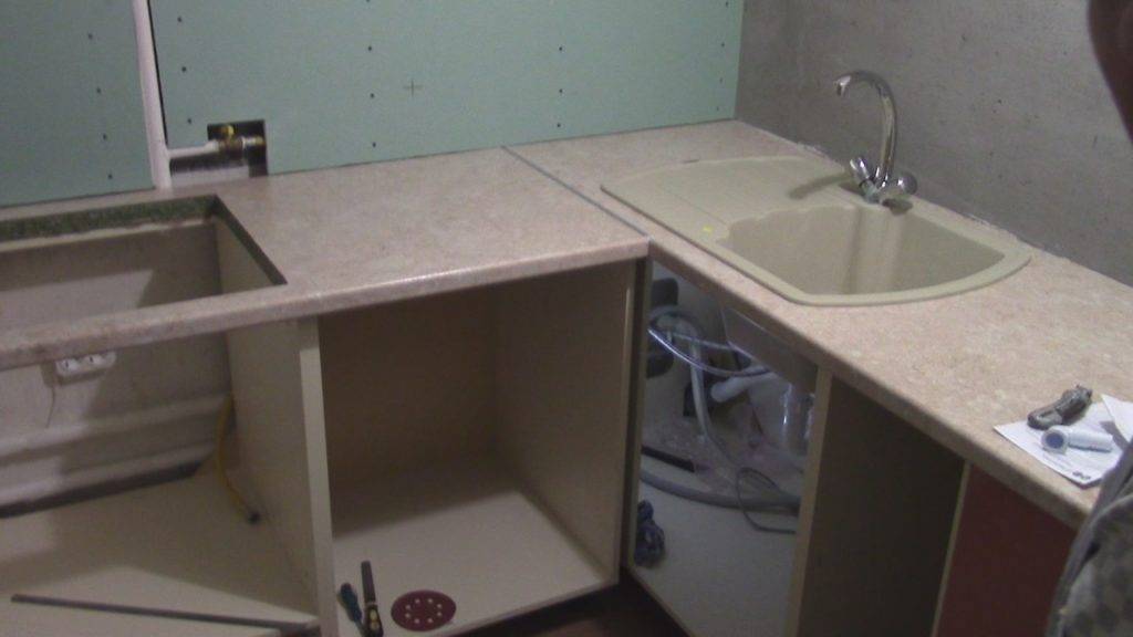 После этого столешницу устанавливают на шкафчики и ровняют по фасадам. Полотно закрепляют шурупами к стенкам шкафчиков