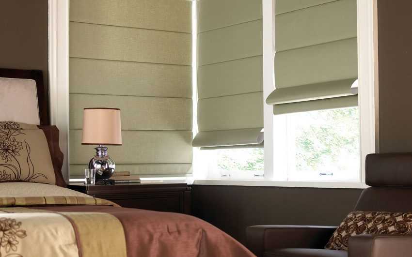 - Римские шторы – экономичный вариант для спальной комнаты. Они совершенно не «утяжеляют» интерьер, производятся из натуральных тканей, их длина достигает подоконника.