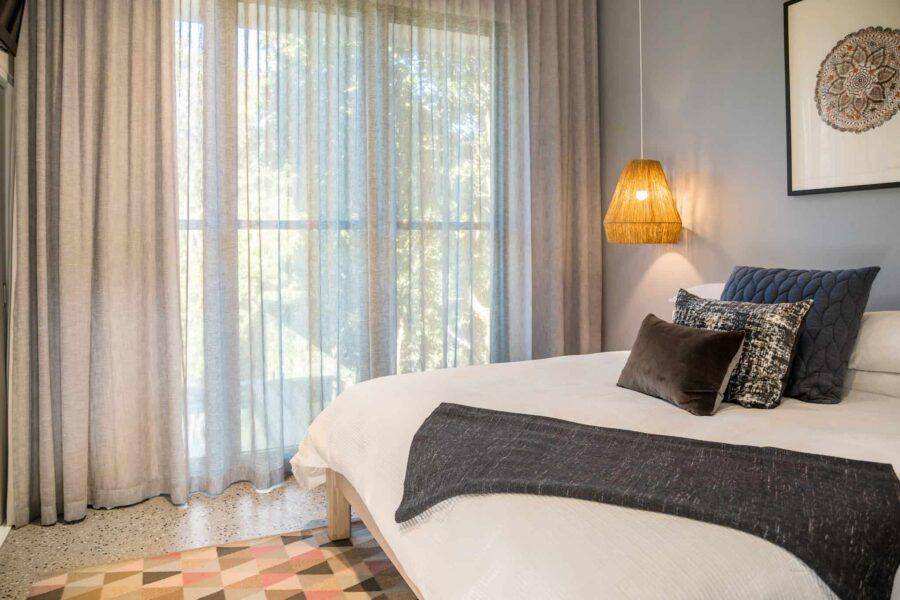 Японские занавески в комбинации с более плотными шторами отлично сочетаются с постельными принадлежностями спальни.