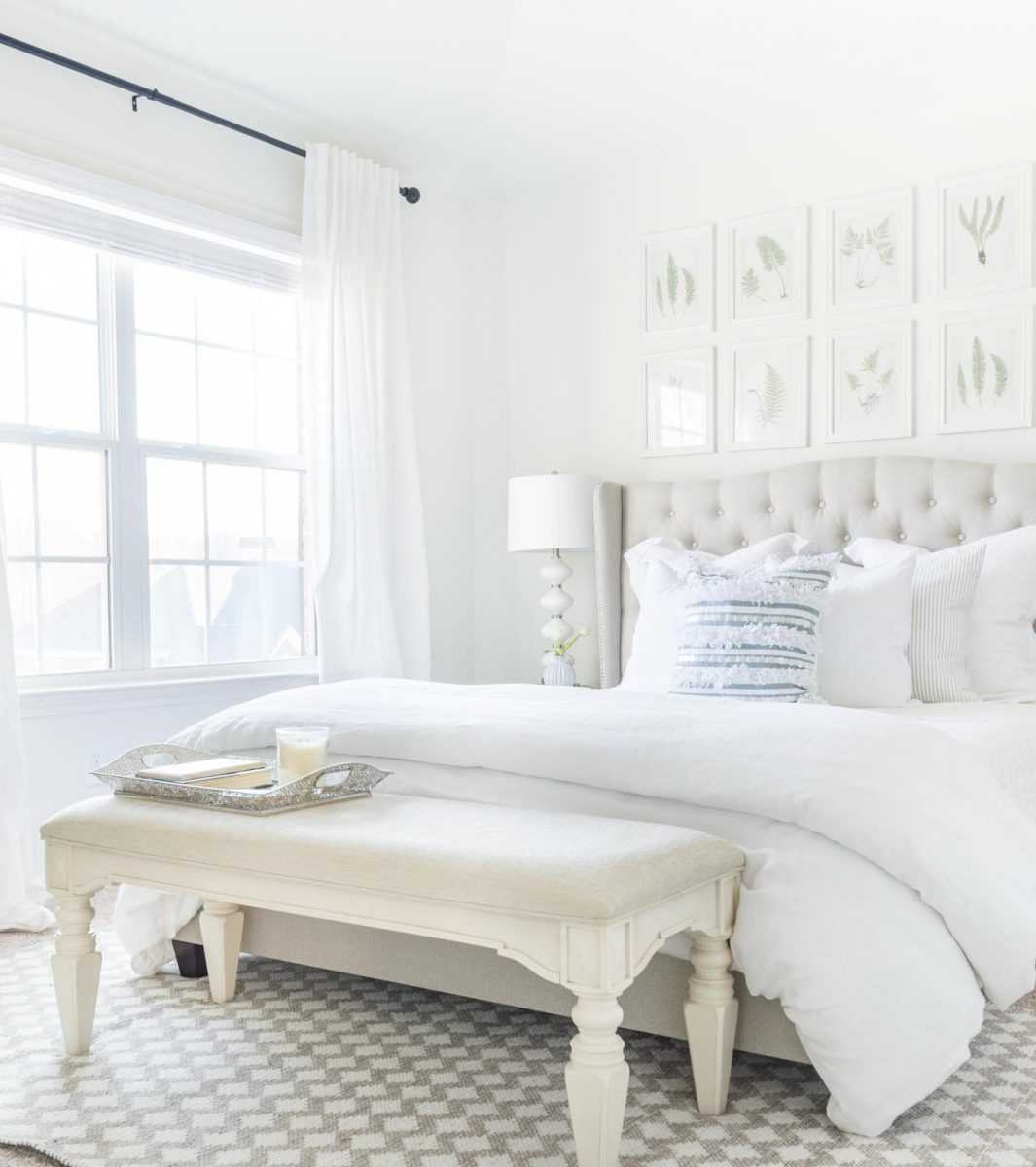 Удачно выбранные шторы для белой спальни защитят от лишнего уличного освещения и создадут легкость и воздушность.