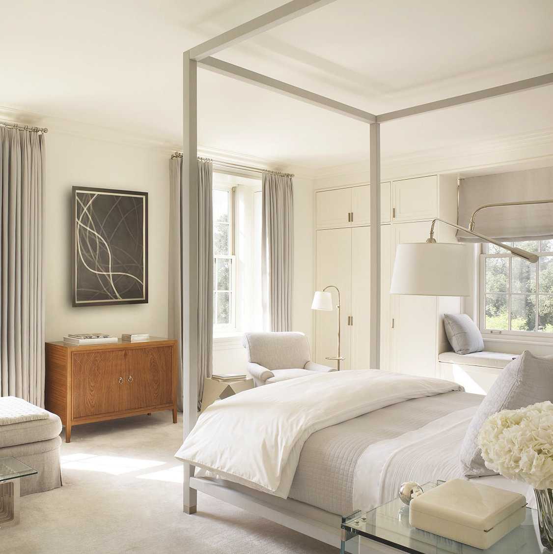 Сочетание умеренно темных портьер и легкого тюля отлично смотрится в большой светлой спальне.