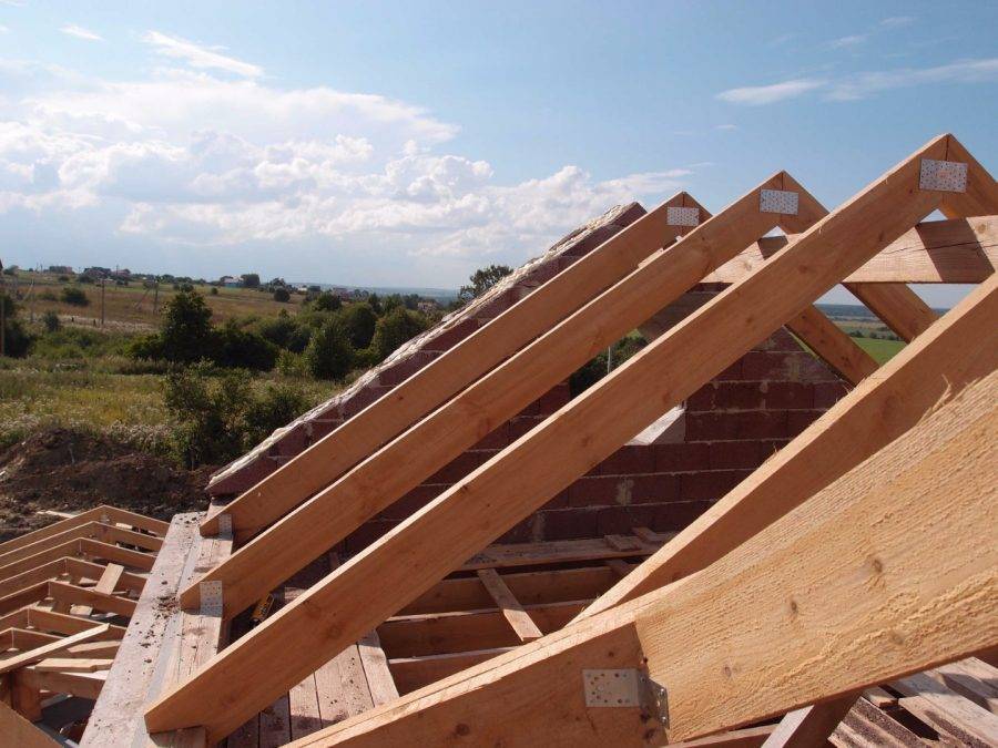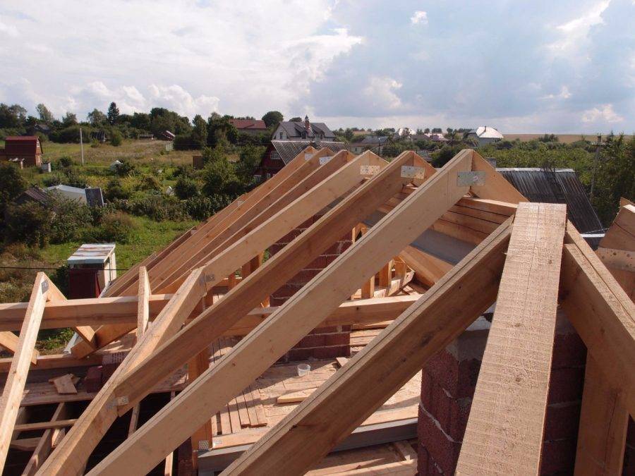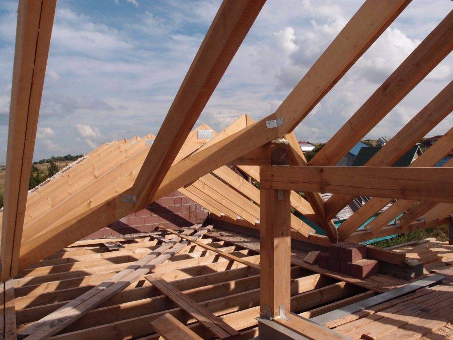 Для прочности соединения используются болты, нагели и скобы, а также зуб и пластины из металла. Чтобы избежать попадания осадков на нижнюю часть стропильной системы, осуществляется монтаж отвесов. Технологический процесс установки кровли предполагает ее вынос за границы внешних стен на 50 см. Карнизный отвес должен быть не менее 550 мм.
