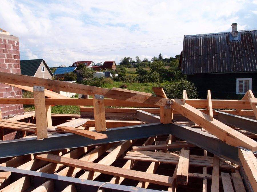 Ещё один способ стыковки – через горизонтальный прогон из повёрнутой на ребро доски. Торцы стропил с обеих сторон крепятся к ней стальными уголками.
