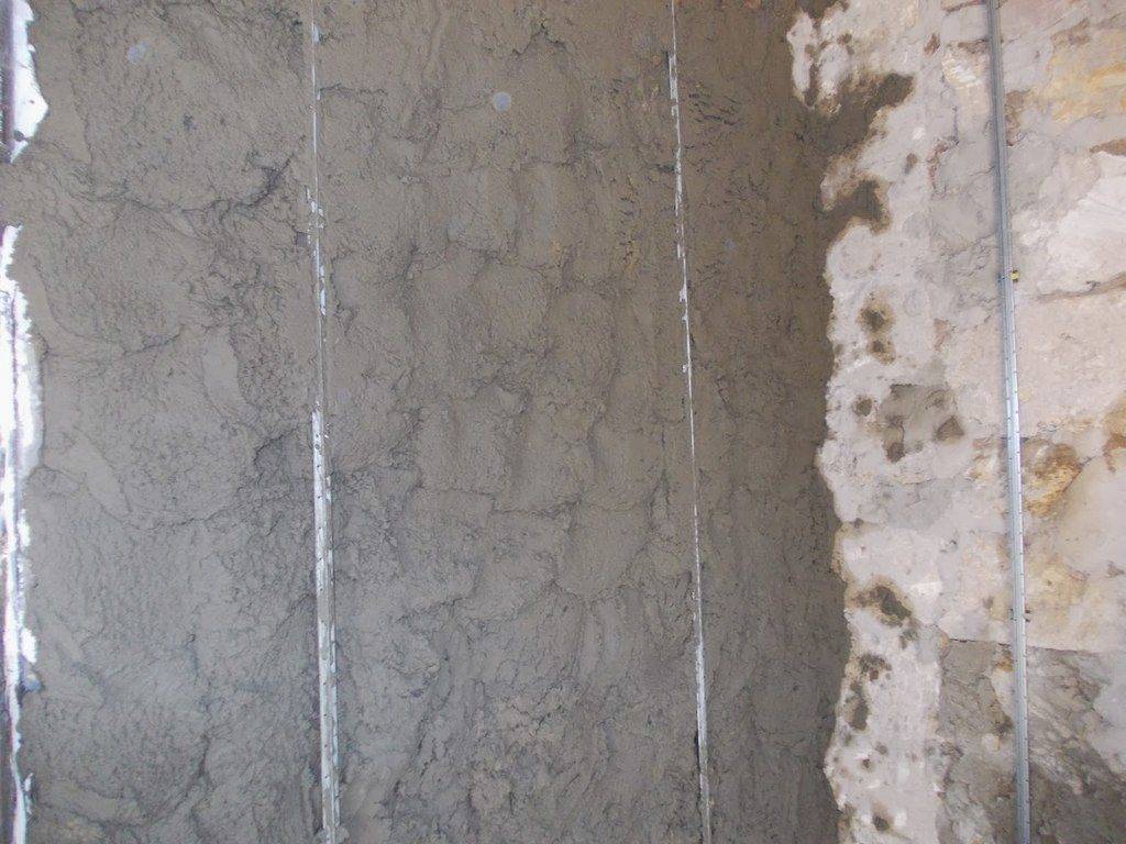 Раствор, можно сказать, наляпывается на стену с небольшого размаха, с усилием, чтобы хорошо сцепиться со стеной.