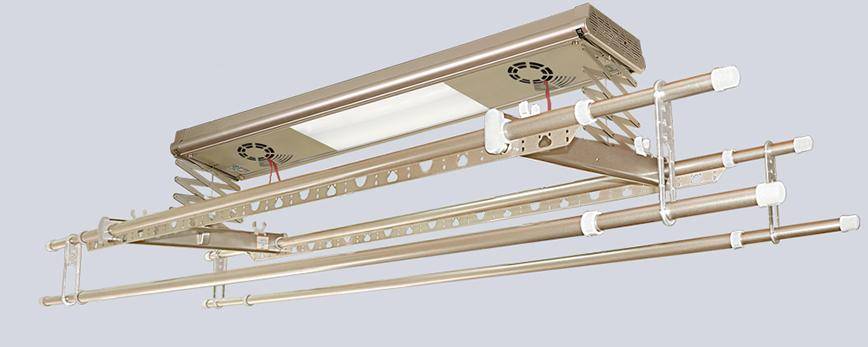 Раздвижной вариант китайского производства Alcona выбирают для малогабаритных помещений. Блок дистанционного управления с подсветкой автоматизированного устройства монтируют на потолке. Сама конструкция из 4 телескопических перекладин поднимается при помощи механизма «гармошки».