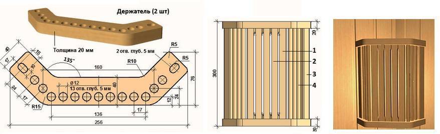 Перед тем как сделать освещение в бане, из ДВП делают шаблоны основных деталей. По шаблону для каркаса светильника из липовой древесины строгают вертикальные рейки с закругленными краями: 4 штуки размерами 750×35×15 см, 8 штук размерами 750×40×15 см, 4 штуки размерами 750×45×15 см и 1 штуку — 550 -50 -20 см (она потребуется при обустройстве паза для стекла).